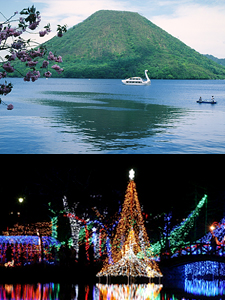 | 上毛三山のひとつとして古くから美しい姿を見せる榛名山。 榛名山の火山の活動によって生まれた榛名湖は、標高1,100mの湖。 湖を囲む外輪山はハイキングコースも整備されている。 毎年12月に榛名湖畔を舞台に40万個以上の電球が装飾されたイルミネーションが幻想的な榛名の夜を演出します。群馬を代表する冬の観光スポット。 |