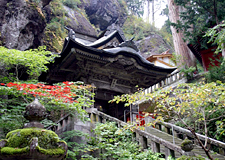 境内に入ると深山幽谷といった雰囲気がぴったりの木立がつづき、社は深い森と巨大な岩や奇石に囲まれるように鎮座しています。
